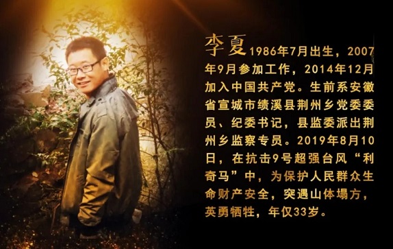 影片中,李夏同志生前是安徽省宣城市績溪縣荊州鄉(xiāng)黨委委員、紀委書記,縣監(jiān)委派出荊州鄉(xiāng)監(jiān)察專員。他堅定理想信念、堅守初心使命,十余年來,始終奮戰(zhàn)在脫貧攻堅、鄉(xiāng)村振興、正風肅紀第一線。他堅持原則、一身正氣,在紀檢監(jiān)察工作崗位上,敢于較真碰硬,鐵面執(zhí)紀執(zhí)法,突出整治群眾身邊腐敗和作風問題,推動全面從嚴治黨不斷向基層延伸。2019年8月10日,在抗擊臺風利奇馬時以身殉職,年僅33歲。