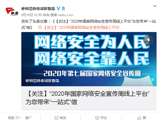 9月14日至20日,根據(jù)城發(fā)公司2020年國家網(wǎng)絡(luò)安全宣傳周實施方案要求,城發(fā)物流公司組織全體黨員干部職工積極開展2020年國家網(wǎng)絡(luò)安全宣傳周系列活動。