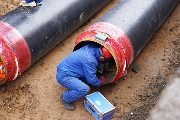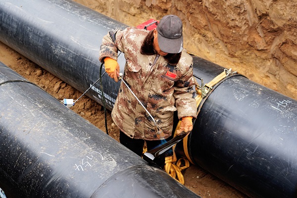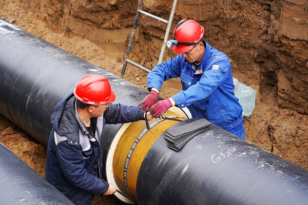 在施工現(xiàn)場,筆者看到,5米深的管溝內(nèi),一段一段已焊接好的DN700管線向遠(yuǎn)方延伸著。在管溝內(nèi),工人們穿著厚厚的棉服,有的在為管道探傷、有的在為管道焊接口做保溫。