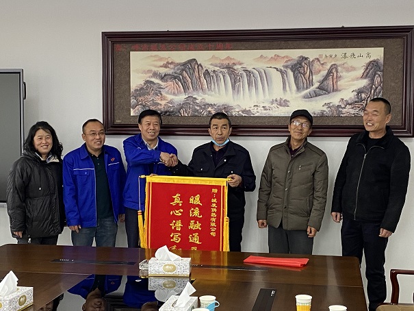 11月29日,西黑河村村長胡滿貴一行四人來到市城市燃熱集團(tuán)公司將一面寫著"暖流融通西黑河真心譜寫和諧曲"的錦旗贈送呼市城發(fā)供熱公司,對城發(fā)供熱公司用心盡力,精心施工,保障供暖,傾情服務(wù)表達(dá)了誠摯的謝意!集團(tuán)公司總工程師胡月在鄭重地接過這份來自村民的認(rèn)可。