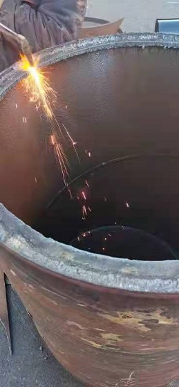 在場人員研究制定了搶修方案,決定不更換管道,而采用"包裹式"的方式進(jìn)行修復(fù)--在原DN700的老舊管道上包裹DN800的管套封堵漏點(diǎn),將DN800的管道切割成兩部分,分別安裝,與水泥管道接近的部分打磨成壁度在4公分以內(nèi)的管壁,焊接后進(jìn)行管道碰口。當(dāng)時(shí),室外溫度已降至-15℃,地溝內(nèi)溫度高,地面溫度低,施工難度大。為保證快速、高效、安全完成新管套接,搶修人員只能手提工具沿著管道貓著腰爬到連接處,窩在管道下方,在管套與管網(wǎng)連接處焊接。