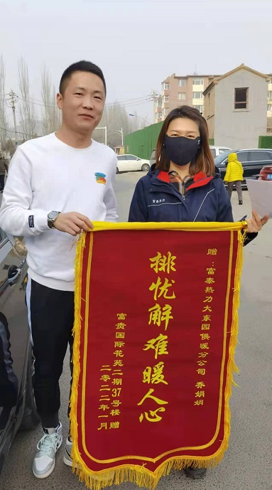 玉泉分公司員工喬娟娟在富貴國(guó)際花園走訪時(shí)得知小區(qū)二期37號(hào)樓進(jìn)入11月份后整棟樓就出現(xiàn)溫度偏低現(xiàn)象,她和同事們迅速開(kāi)始排查原因。該棟樓共有5層10戶(hù)熱用戶(hù),他們用了一天時(shí)間逐層逐戶(hù)對(duì)熱用戶(hù)家中的濾網(wǎng)進(jìn)行了清洗,但是效果不是很理想。于是他們又對(duì)負(fù)一層主管網(wǎng)的除污器進(jìn)行了清洗,一系列的操作完成后又是整整一天,第二天回訪熱用戶(hù)時(shí)得知溫度只提升了2度,為了讓熱用戶(hù)溫暖過(guò)冬,喬娟娟又和同事們對(duì)該棟樓主管道的所有支管進(jìn)行了沖洗,再次回訪熱用戶(hù)時(shí)發(fā)現(xiàn),該棟樓其他熱用戶(hù)家中溫度都很好,只有301熱用戶(hù)家中的溫度還是偏低,為了找到原因,喬娟娟和同事們對(duì)用戶(hù)家中的暖氣管道敷設(shè)情況進(jìn)行了測(cè)量,再次沖洗了管道,同時(shí)積極聯(lián)系到已經(jīng)辦理停供的401熱用戶(hù)進(jìn)行了復(fù)供,該熱用戶(hù)家中溫度偏低問(wèn)題得到解決。"排憂(yōu)解難暖人心"為了表達(dá)感謝之情,1月9日,301熱用戶(hù)聯(lián)系到了正在小區(qū)走訪的喬娟娟,親手遞給她一面錦旗。