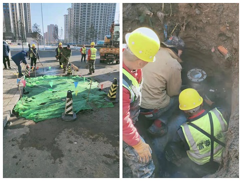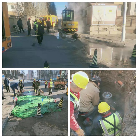 大年初二這天早上,富泰熱力公司巴彥分公司廠區(qū)門口路面滲水,疑似一次網(wǎng)發(fā)生跑水。得知這一情況后,分公司檢修所工作人員在對跑水位置進(jìn)行初步判斷后,立即聯(lián)系了安裝分公司。嚴(yán)陣以待的安裝分公司搶修隊(duì)員第一時間趕往現(xiàn)場,發(fā)現(xiàn)現(xiàn)場有配電箱,地下有電纜、天然氣管,機(jī)械開挖比較危險,于是人工對路面進(jìn)行開挖,進(jìn)一步尋找漏點(diǎn)。經(jīng)過查找,發(fā)現(xiàn)是一次網(wǎng)上一個50抽頭發(fā)生跑水,他們不顧刺骨寒風(fēng)帶水作業(yè),給抽頭焊接了一個150的套管,又在套管上安裝了一個150的法蘭球閥,等做好保溫回填地面后,已經(jīng)是第二天凌晨4點(diǎn)了。大年初五,安裝分公司又接到了左右城小區(qū)跑水搶修任務(wù)。由于施工難度較大,搶修隊(duì)員們一刻不停歇的干了一天才完成任務(wù),及時恢復(fù)了供暖。