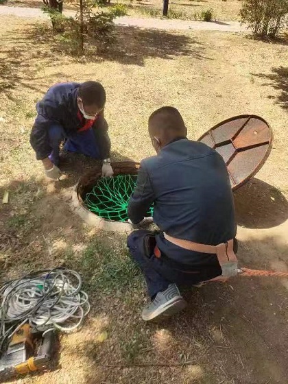 安裝現(xiàn)場,工作人員打開井蓋通風,在用氣體檢測儀檢測井內(nèi)的氣體符合作業(yè)條件后,工作人員綁好安全帶用電鉆在井壁上鉆孔,釘入尾端帶鉤的膨脹螺栓,擰緊固定后將防墜網(wǎng)掛到掛鉤上,一張防墜網(wǎng)就安裝完成。現(xiàn)場工程師傅每完成一個防墜網(wǎng)的安裝,在確保安全的情況下,都會親身踩試檢驗,確保安裝牢固。