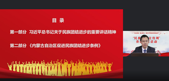 本次培訓(xùn)以良法善治,凝心聚力,鑄牢中華民族共同體意識為主題,中國政法大學(xué)劉東剛博士圍繞習(xí)近平總書記關(guān)于民族團結(jié)進步的重要講話指示精神、《中國共產(chǎn)黨統(tǒng)一戰(zhàn)線工作條例》《內(nèi)蒙古自治區(qū)促進民族團結(jié)進步條例》《中華人民共和國國家通用語言文字法》《內(nèi)蒙古自治區(qū)實施〈中華人民共和國國家通用語言文字法〉辦法》《民族區(qū)域自治法》《城市民族工作條例》的重點亮點內(nèi)容進行了解讀。
