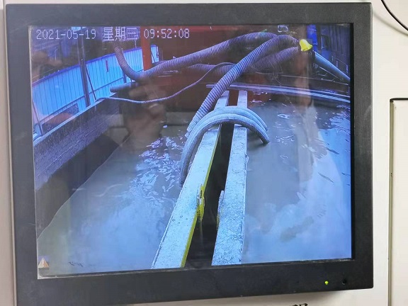 在頂管操作室,可以從電子顯示屏上清晰看到井底施工的畫面,狹窄的空間里兩名個(gè)人不停的用鐵鍬將設(shè)備挖出的沙土推到水里混合。