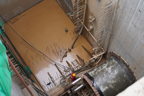 施工現(xiàn)場(chǎng)機(jī)器轟鳴,說話需要提高分貝。一進(jìn)入施工現(xiàn)場(chǎng),就看到前方有一個(gè)沉井,沉井20米深、13.4*7.3米間方,這個(gè)沉井是挖掘井,在河的對(duì)岸還有一個(gè)深15.5米的接收井。從沉井圍欄邊看井底,下邊的工作人員都顯得特別的渺小,20米深的井相當(dāng)于6層樓高,恐高的人都不敢往下看。
