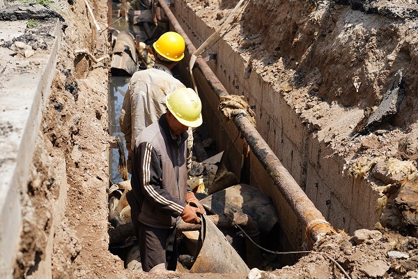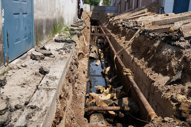 開天花園小區(qū)施工直播結(jié)束后,我們直播組直奔如意小區(qū)供熱二次管網(wǎng)改造的施工現(xiàn)場(chǎng)。循著一陣陣的臭味,我們來到了如意小區(qū)的A區(qū)一幼兒園后面,映入眼簾的是正在抽排污水的地溝,地溝中的供熱管線距污水水面非常近,污水在炎熱天氣的發(fā)酵下,臭氣熏天。工人們正在深溝里進(jìn)行排污及淤泥清理工作,每一個(gè)動(dòng)作都顯得格外艱難,衣服幾乎和污水一個(gè)顏色。