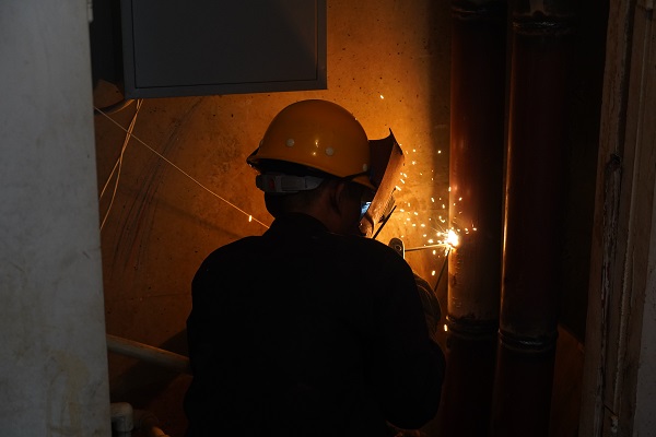 上午9:30時(shí),直播組來到開天花園北區(qū)1號(hào)樓前,小區(qū)供熱主線的管溝內(nèi),一工人師傅穿著長褂,帶著手套在狹小的空間內(nèi)正嫻熟地進(jìn)行焊接,飛濺的火花下面,看不清楚他的臉,待焊接完一段后,他取下電焊面罩,露出一張黑紅黑紅的臉,汗水順著額頭直瀉而下,汗珠吧嗒吧嗒流在眼里、滴到了地上,不時(shí)用衣袖擦眼睛。他告訴筆者,地面溫度是36°,他焊接的周邊溫度要達(dá)到50多度。面對(duì)高溫的"烤"驗(yàn),他全然不顧,用他的話說:這是他們的工作常態(tài),早已習(xí)慣。