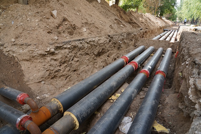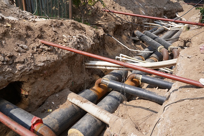 在開天花園小區(qū)熱力站供熱管線出口區(qū)域,兩名工人師傅正在清理現(xiàn)場(chǎng)的供熱管線?,F(xiàn)場(chǎng)看到管溝內(nèi)鋪設(shè)的主管線、與樓宇的抽頭安裝已全部完工,溝內(nèi)自來水管線、污水管線、弱電管線、強(qiáng)電管線縱橫交錯(cuò)。