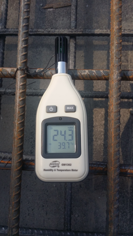 2017年7月18日上午10:30左右,呼和浩特市低碳供熱亞行貸款項(xiàng)目辛家營熱源廠中繼泵房蓄水池墻體和消防泵房梁柱開始澆筑,此時施工現(xiàn)場溫度為39.7℃。