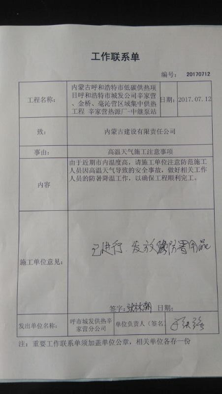 為此,工程自3月31日開工以來,全體參加建設(shè)的單位和個人,克服種種困難,加班加點(diǎn),在保證安全和質(zhì)量的前提下,為確保今冬按時投運(yùn)而努力施工;尤其是近日持續(xù)高溫以來,為既能確保施工人員的安全,又能確保工期不后延,施工方采取了早上工,晚收工,午增加休息時間,給施工人員熬制防暑綠豆湯等辦法,從而保證了施工有效時間,確保工期沒有任何延誤。同時,我分公司為保證暑期施工人員安全,及時給施工單位下發(fā)了《工作聯(lián)系單》,對高溫天氣施工提出要求,并要求施工單位有具體防暑措施。