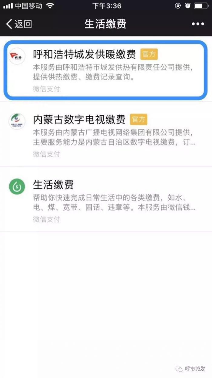 正確的微信繳費流程:我-錢包-城市服務(wù)-便民服務(wù)(生活繳費)-呼和浩特城發(fā)供暖繳費(官方)