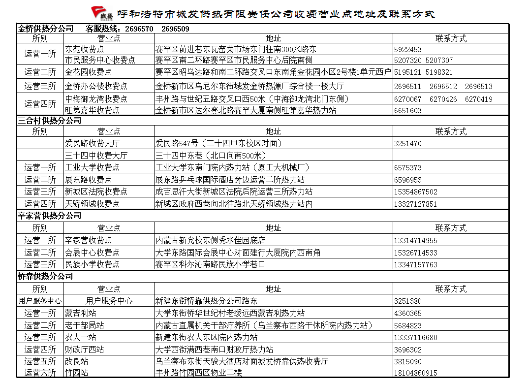 城發(fā)供熱公司收費營業(yè)點地址及聯(lián)系方式