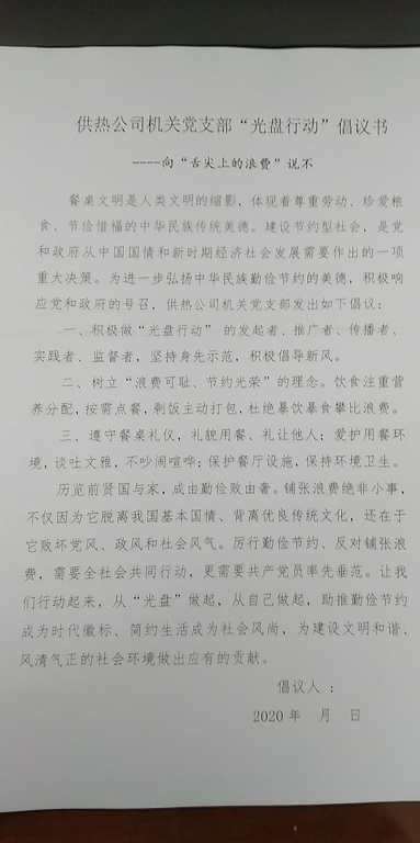 為了進一步弘揚中華民族勤儉節(jié)約的美德,積極響應黨和政府的號召。9月9日上午開始,城發(fā)供熱公司機關黨支部黨員、發(fā)展對象、積極分子共40人陸續(xù)簽署“光盤行動”倡議書。