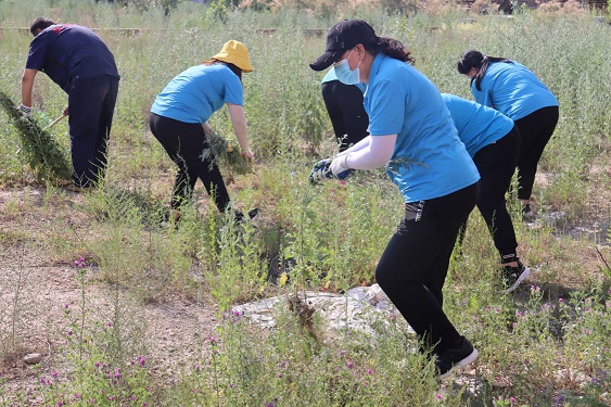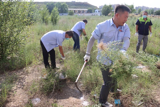 活動(dòng)現(xiàn)場(chǎng),黨支部書記娜仁、經(jīng)理史濤帶領(lǐng)大家在各自的責(zé)任區(qū)域內(nèi)分片作業(yè)。大家在炎炎烈日下,揮汗如雨、干勁十足,有的拔除蒿草、有的收集清運(yùn)……經(jīng)過一下午地辛勤作業(yè),小區(qū)及周邊的蒿草不見了,空氣清新了,環(huán)境也變美了。